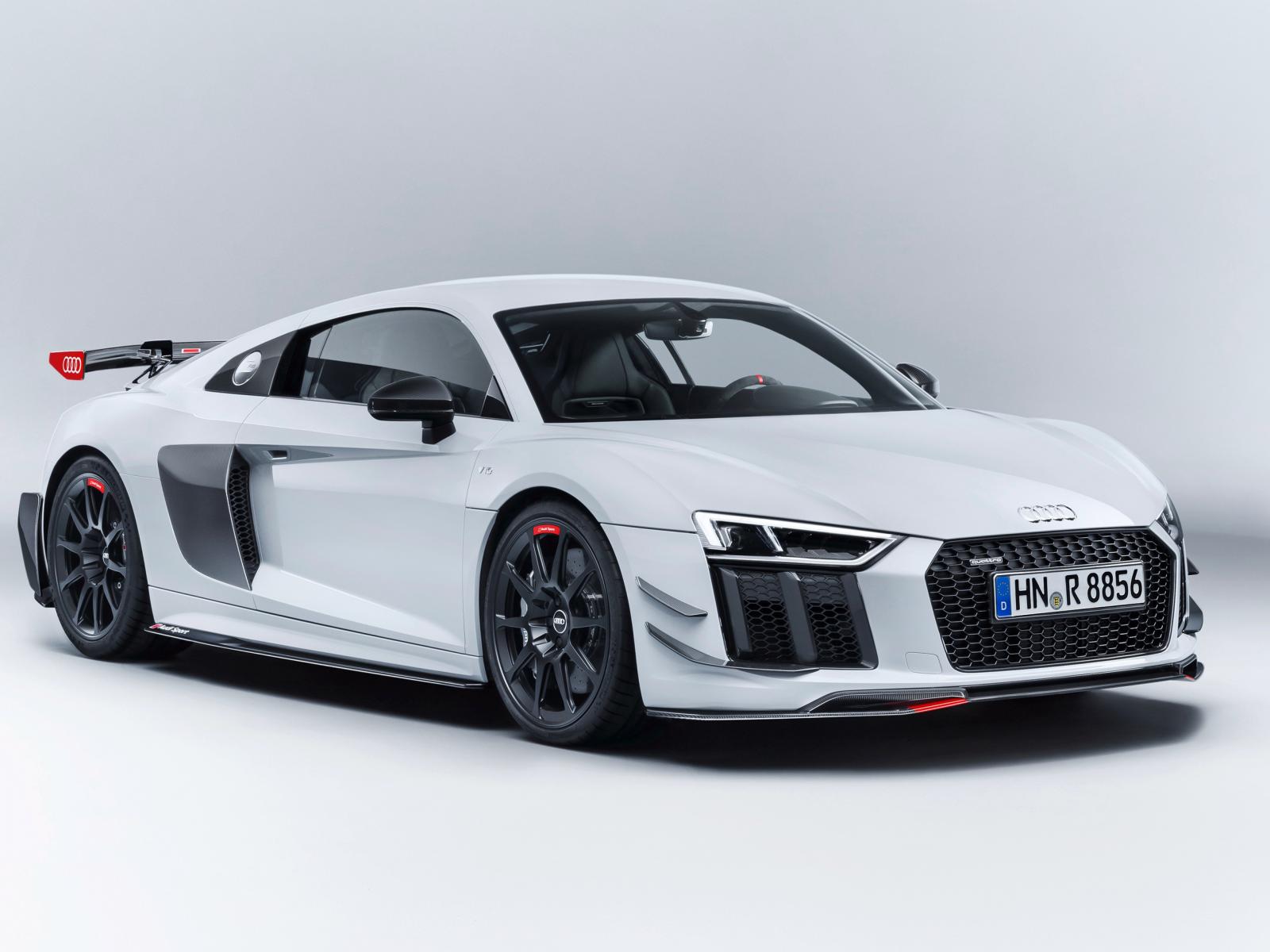 Обои Спортивный автомобиль Audi R8 v10, 2018 на сером фоне