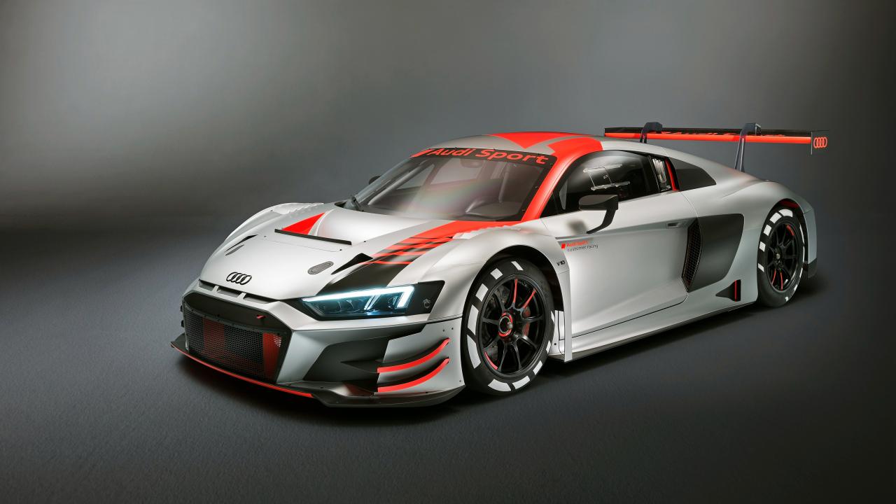Обои Спортивный автомобиль Audi R8 LMS 2019 года на сером фоне