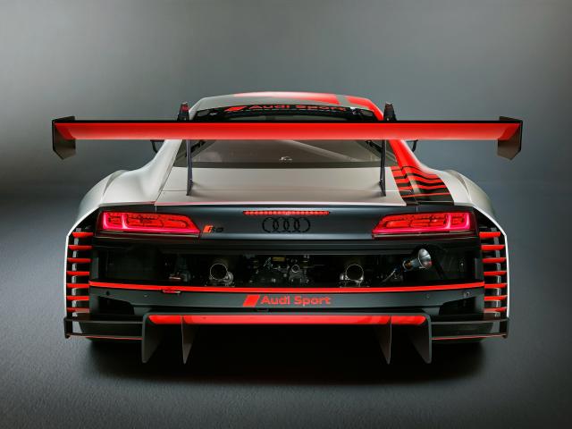 Обои Спортивный автомобиль Audi R8 LMS 2019 года на сером фоне вид сзади