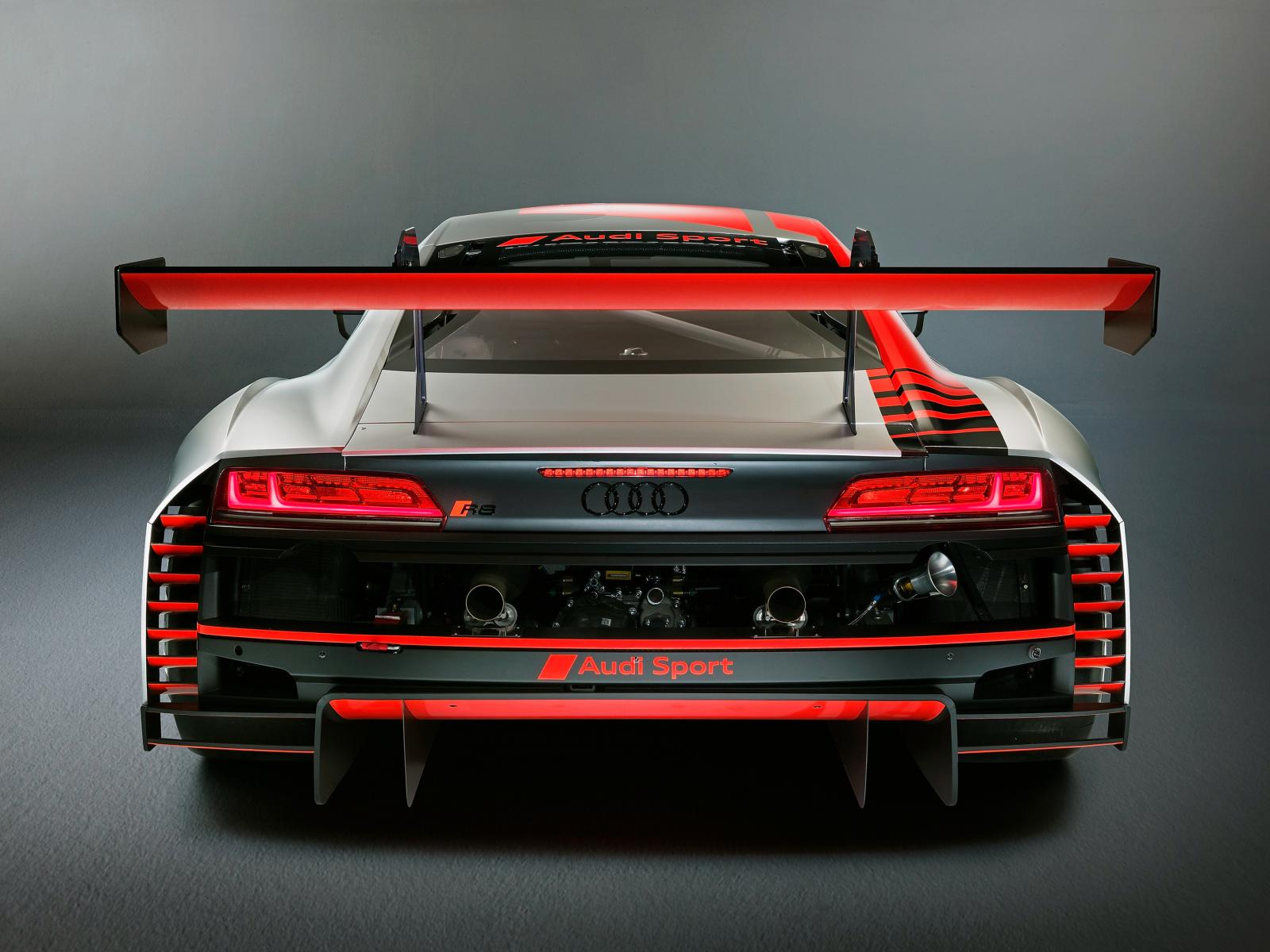 Обои Спортивный автомобиль Audi R8 LMS 2019 года на сером фоне вид сзади