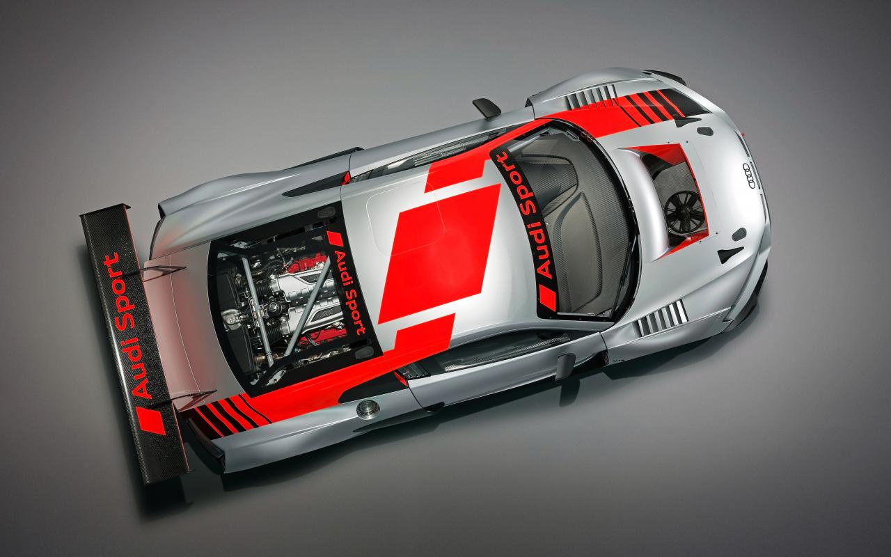 Обои Спортивный автомобиль Audi R8 LMS 2019 года на сером фоне вид сверху
