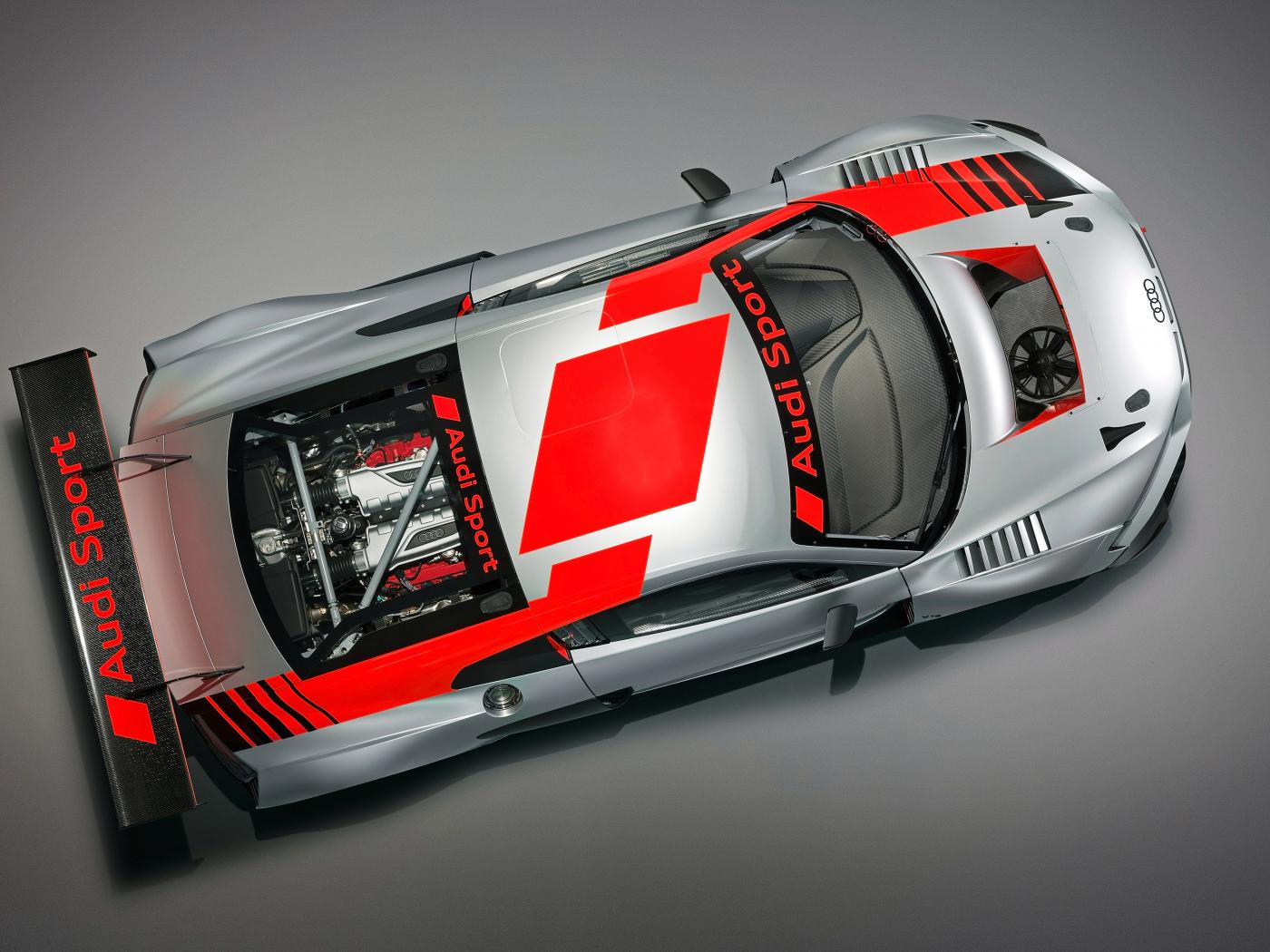 Обои Спортивный автомобиль Audi R8 LMS 2019 года на сером фоне вид сверху