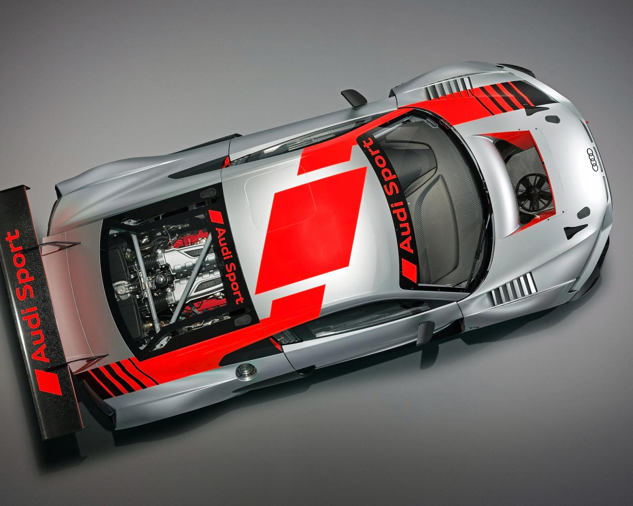Обои Спортивный автомобиль Audi R8 LMS 2019 года на сером фоне вид сверху