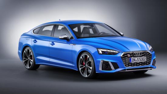 Обои Синий автомобиль Audi S5 Sportback TDI 2019 года на сером фоне