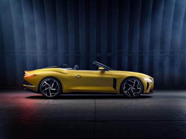Обои Желтый кабриолет Bentley Mulliner Bacalar 2020 года вид сбоку