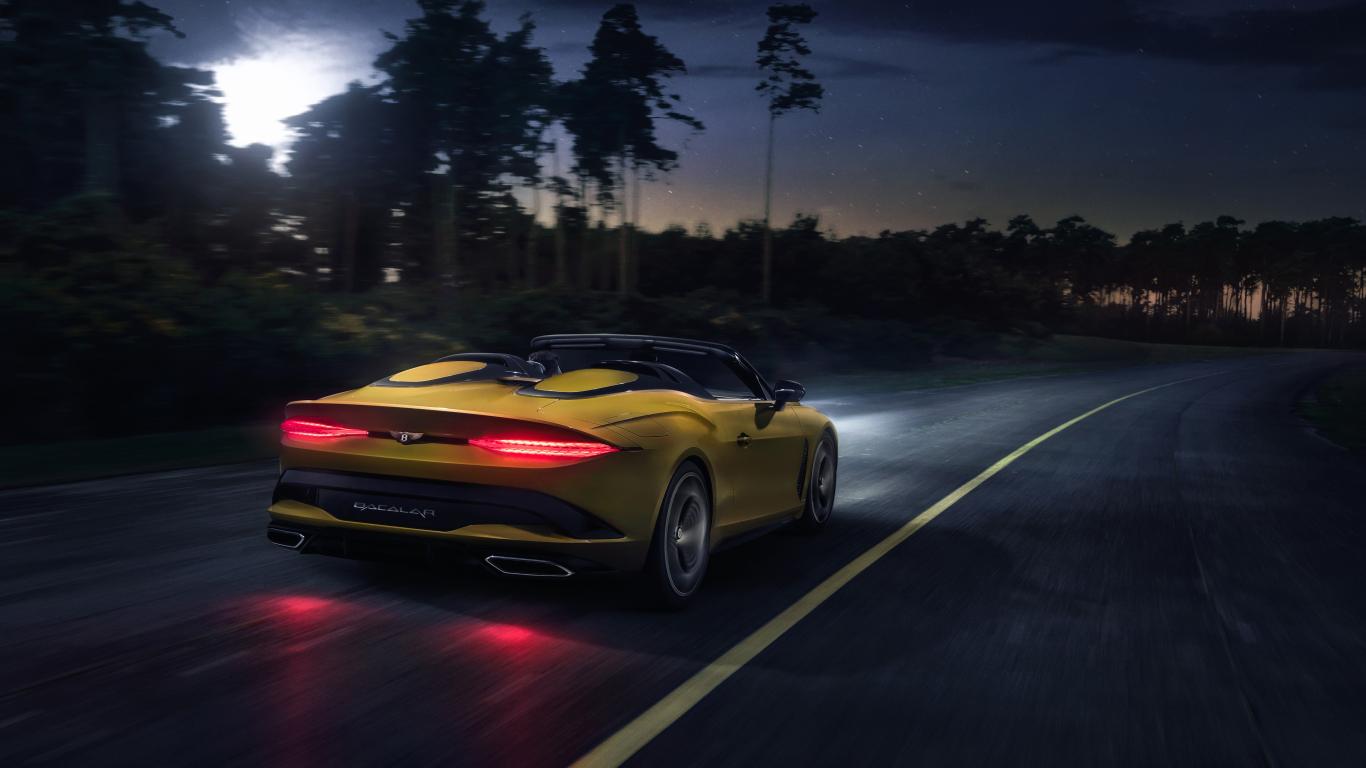 Обои Желтый автомобиль Bentley Mulliner Bacalar 2020 года на ночной трассе