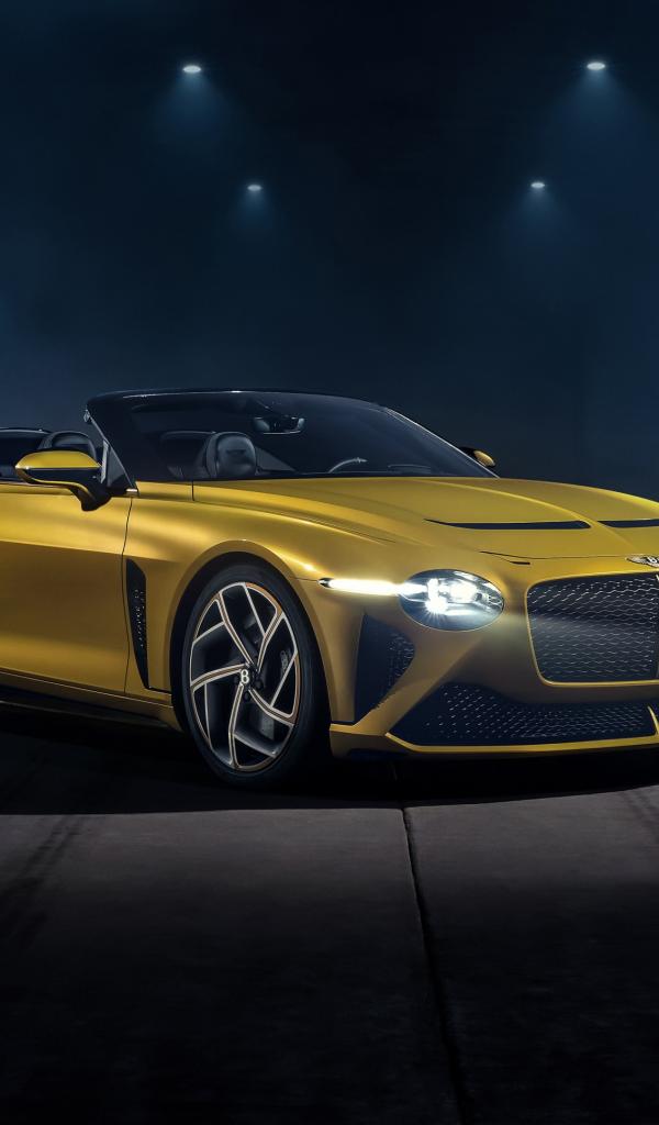 Обои Желтый автомобиль Bentley Mulliner Bacalar 2020 года в свете софитов