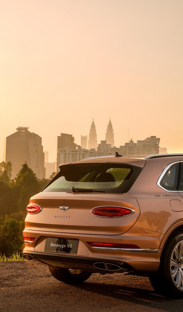 Обои Автомобиль Bentley Bentayga V8 2020 года вид сзади на фоне города