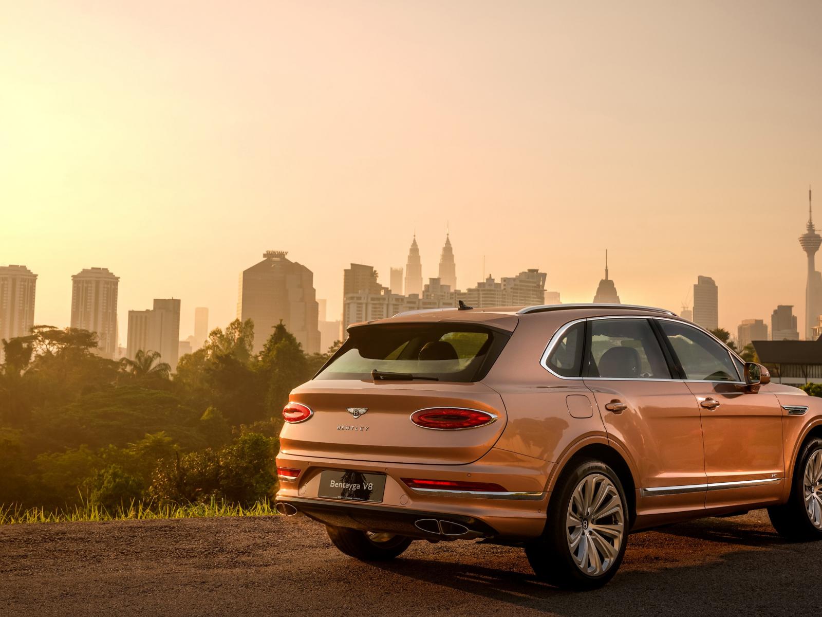 Обои Автомобиль Bentley Bentayga V8 2020 года вид сзади на фоне города