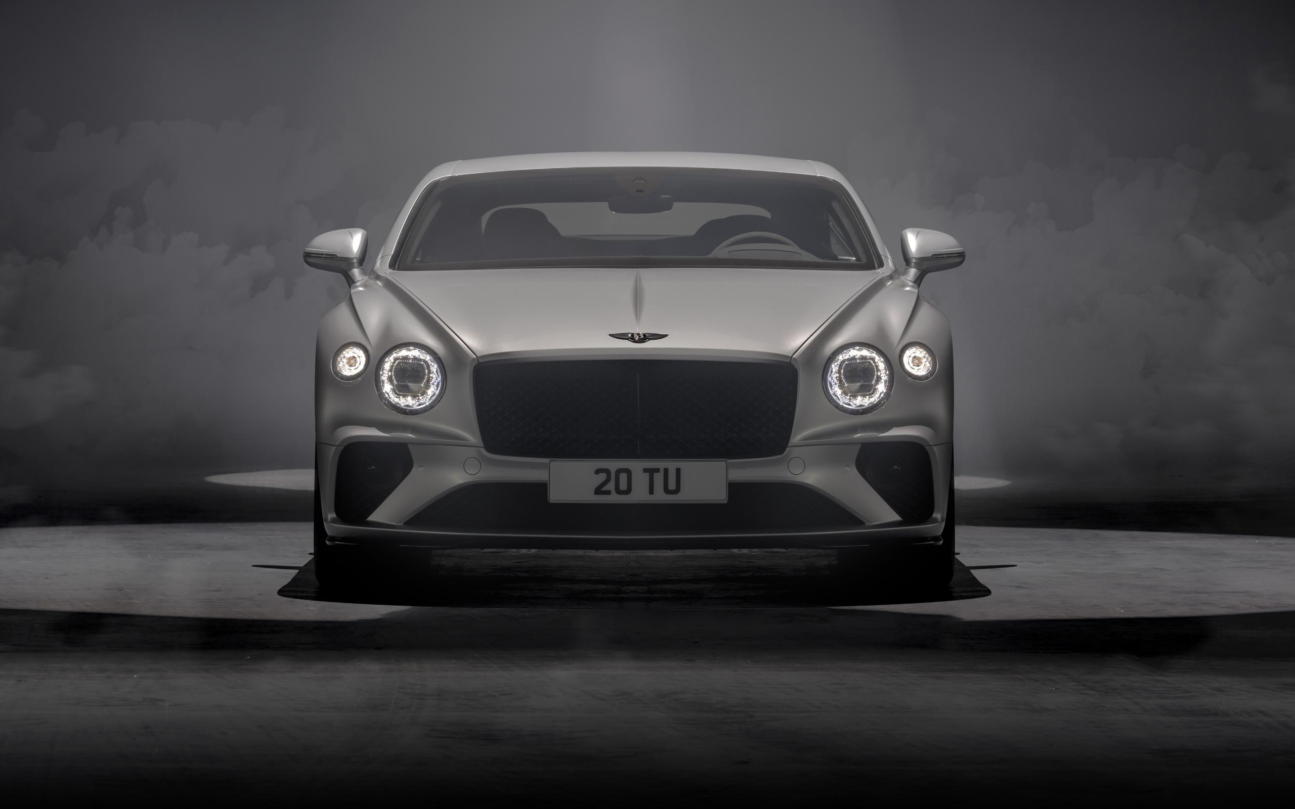Обои Серебристый автомобиль Bentley Continental GT Speed 2021 года на сером фоне