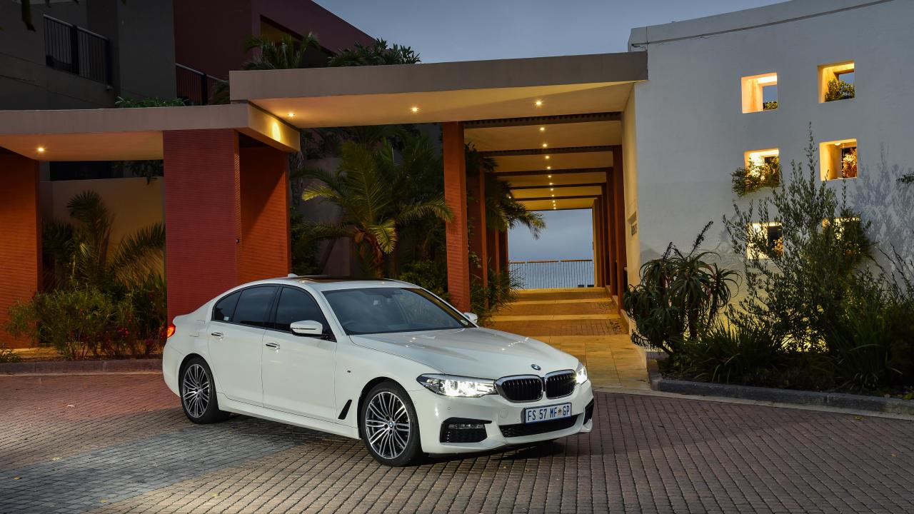 Обои Белый автомобиль BMW 530d Sedan M Sport, 2017 года у дома