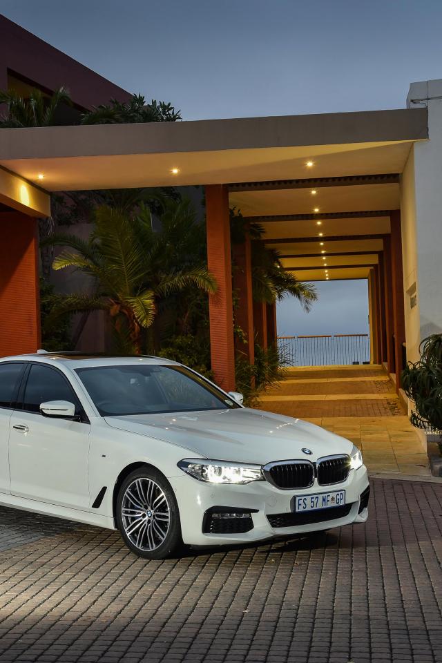 Обои Белый автомобиль BMW 530d Sedan M Sport, 2017 года у дома