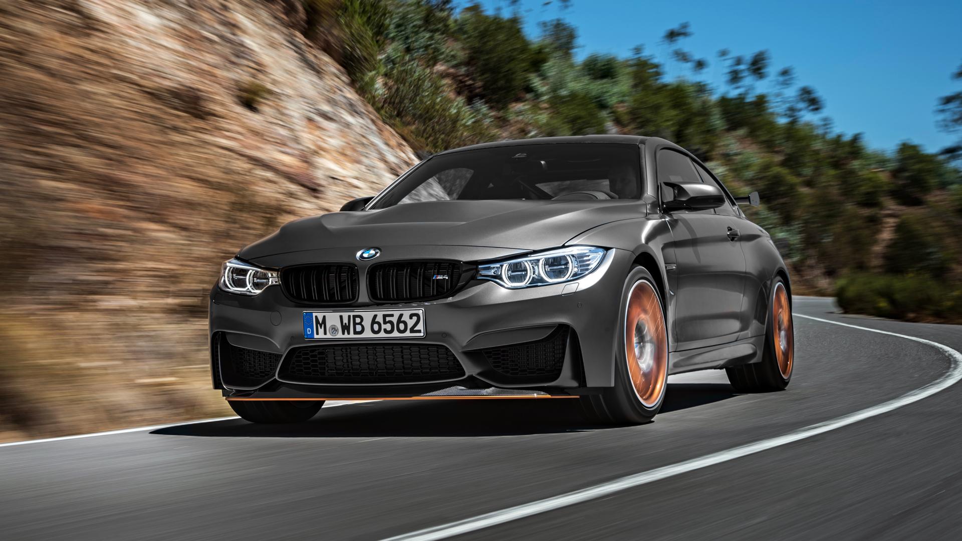 Обои Серебристый стильный автомобиль BMW M4 на трассе