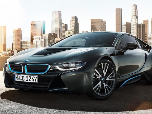 Обои Спортивный черный БМВ на фоне мегаполиса