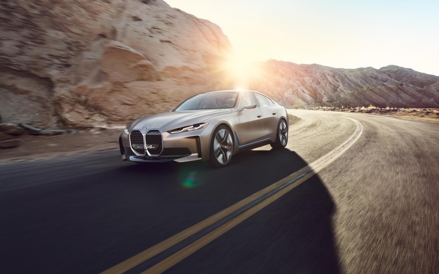 Обои Автомобиль BMW Concept I4 2020 года у гор в лучах солнца