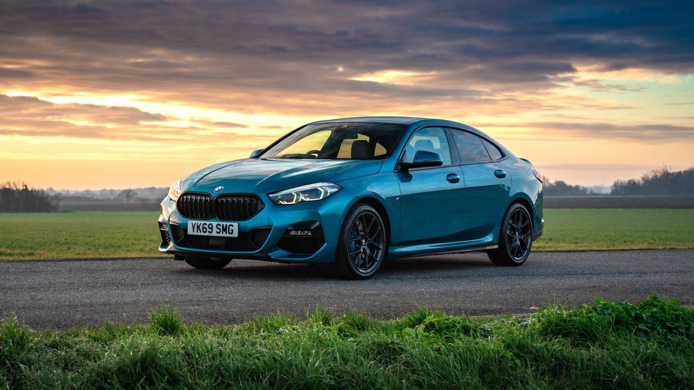 Обои Синий автомобиль BMW 218i Gran Coupe M Sport 2020 года на фоне заката