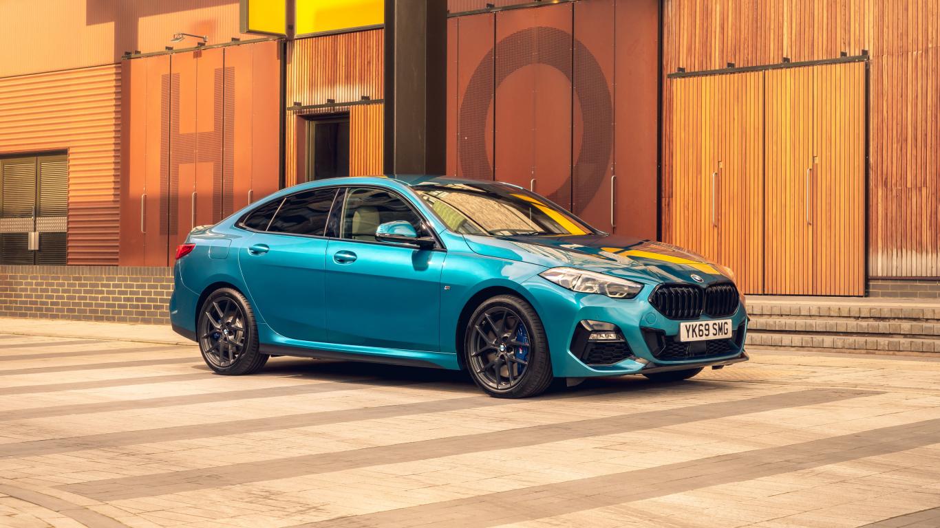 Обои Синий автомобиль BMW 218i Gran Coupe M Sport 2020 года у здания