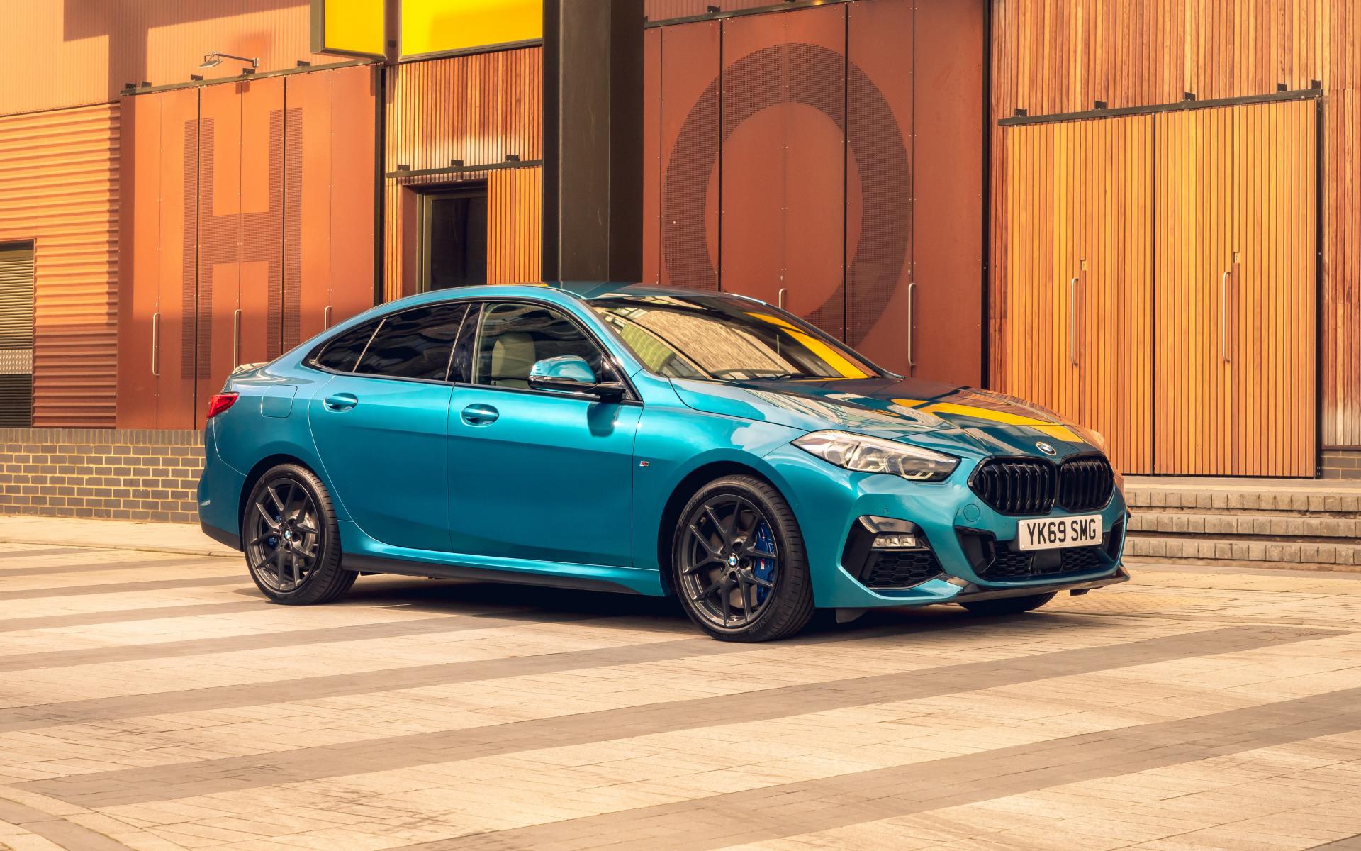 Обои Синий автомобиль BMW 218i Gran Coupe M Sport 2020 года у здания