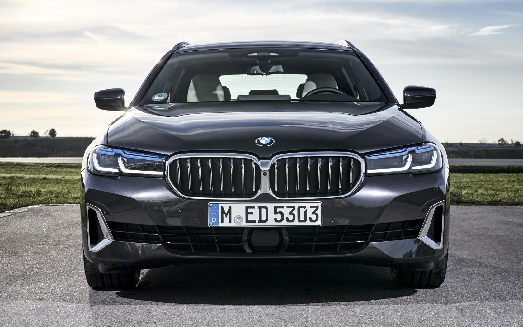 Обои Черный автомобиль BMW 530d XDrive Touring Luxury Line 2020 года вид спереди