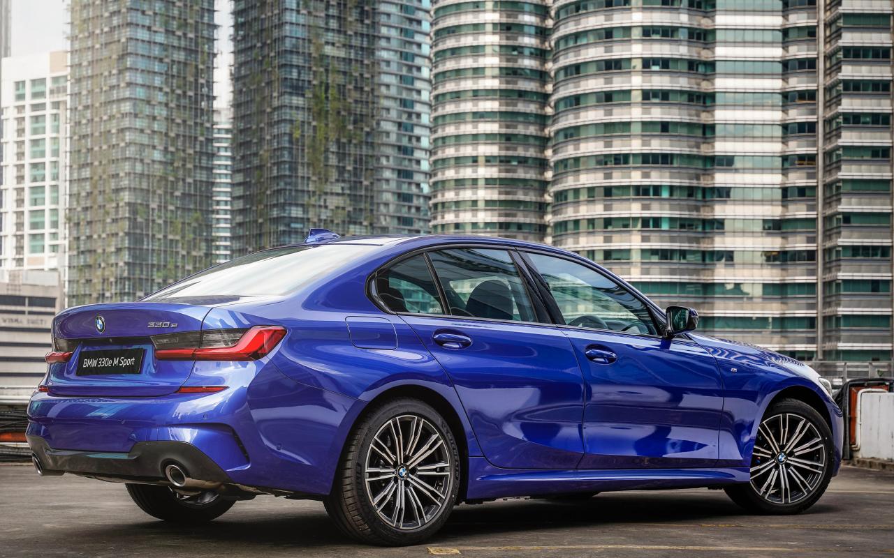 Обои Дорогой автомобиль BMW 330e M Sport 2021 года вид сзади