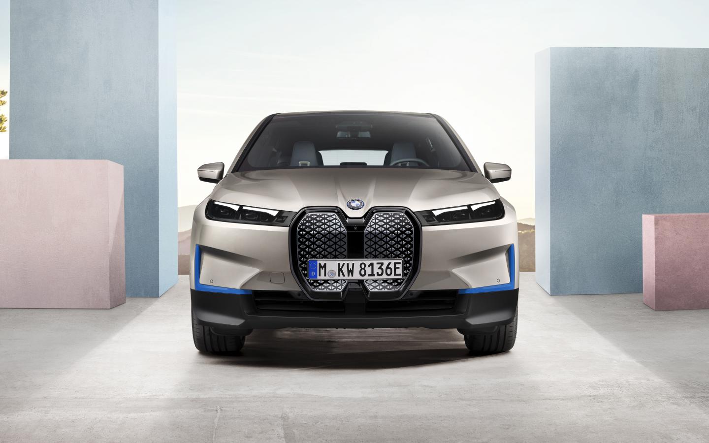 Обои Серебристый автомобиль BMW IX 2021 года вид спереди