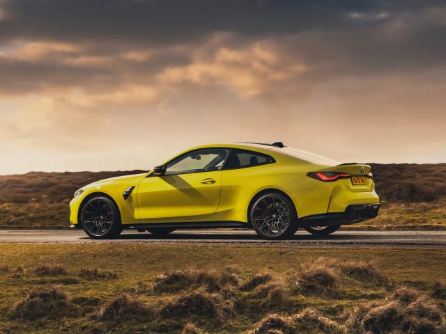 Обои Быстрый желтый автомобиль BMW M4 Competition 2021 года