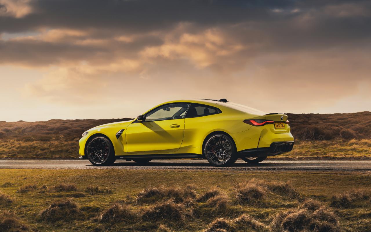 Обои Быстрый желтый автомобиль BMW M4 Competition 2021 года