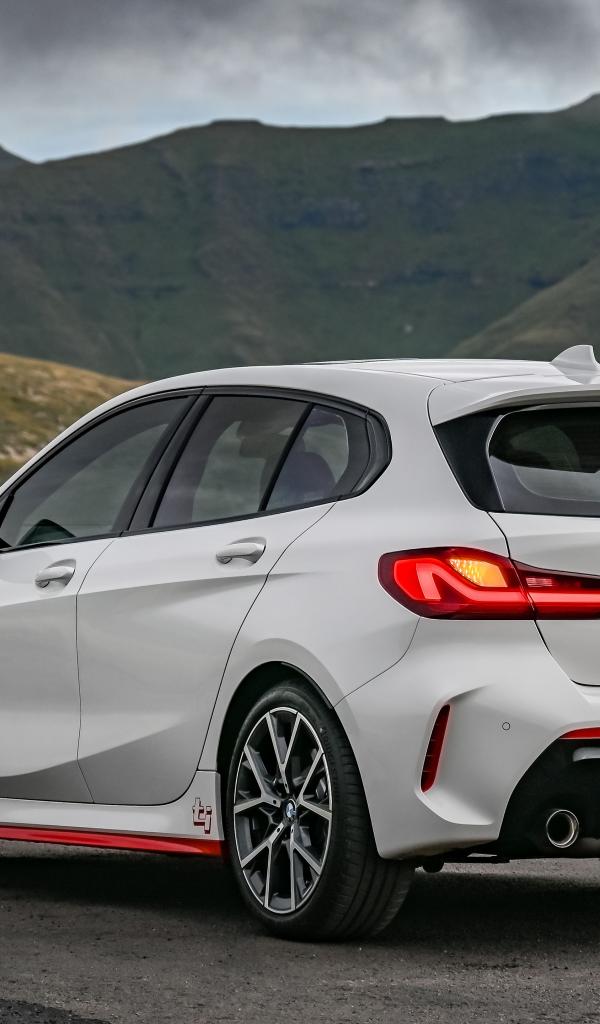 Обои Белый автомобиль BMW 128ti 2021 года вид сзади на фоне гор