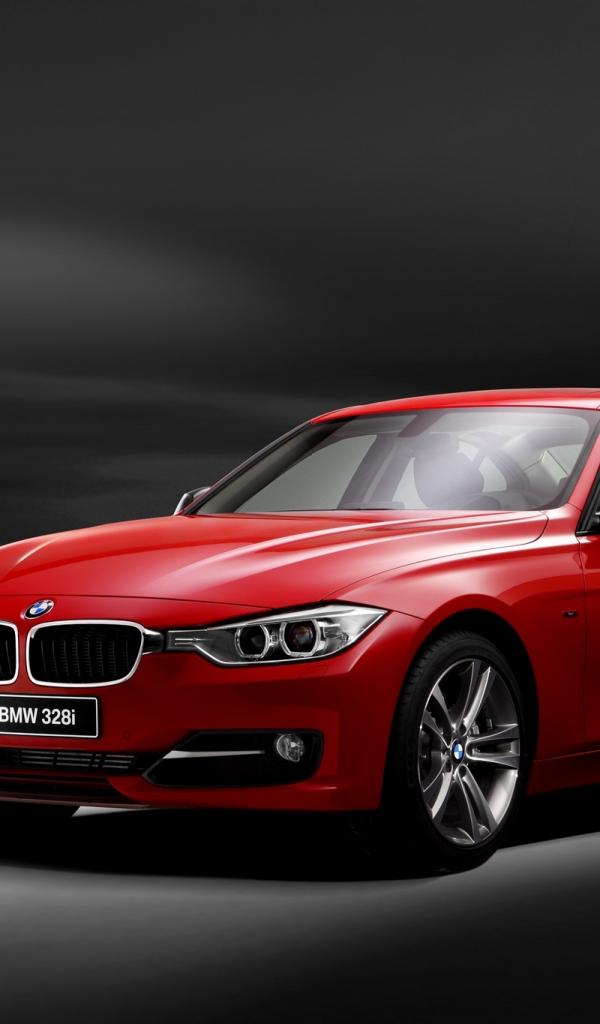 Обои Красный автомобиль BMW 3 Series на сером фоне