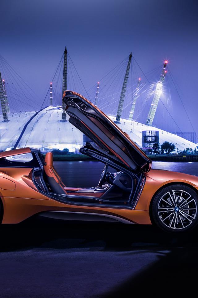 Обои Спортивный автомобиль BMW I8 Roadster, 2018 с открытыми дверями