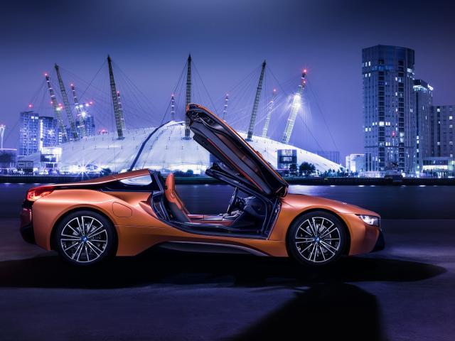 Обои Спортивный автомобиль BMW I8 Roadster, 2018 с открытыми дверями