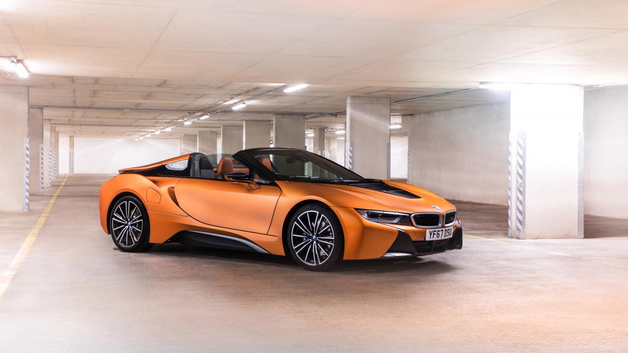 Обои Оранжевый кабриолет BMW i8 на подземной парковке