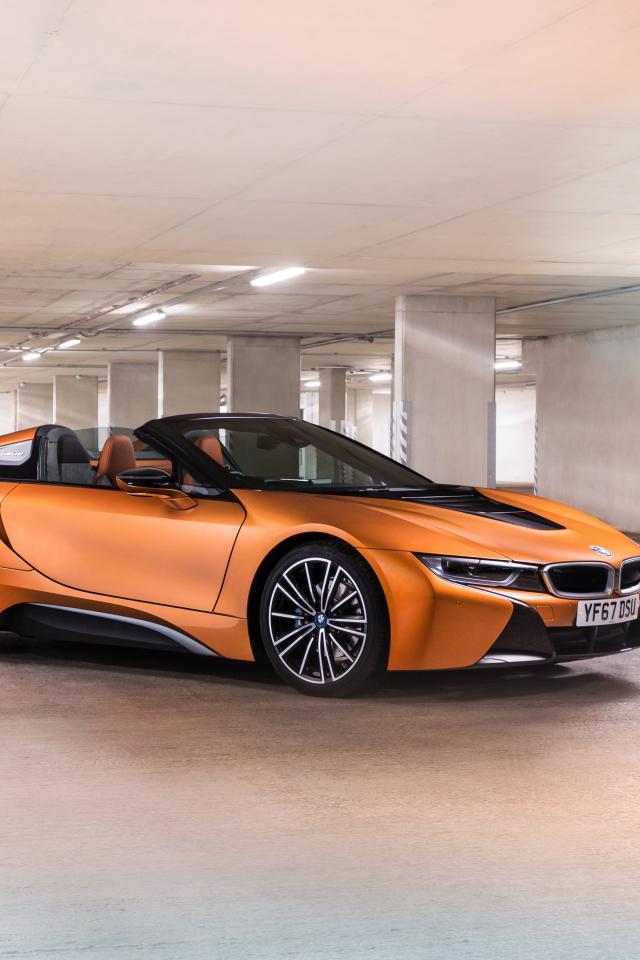 Обои Оранжевый кабриолет BMW i8 на подземной парковке