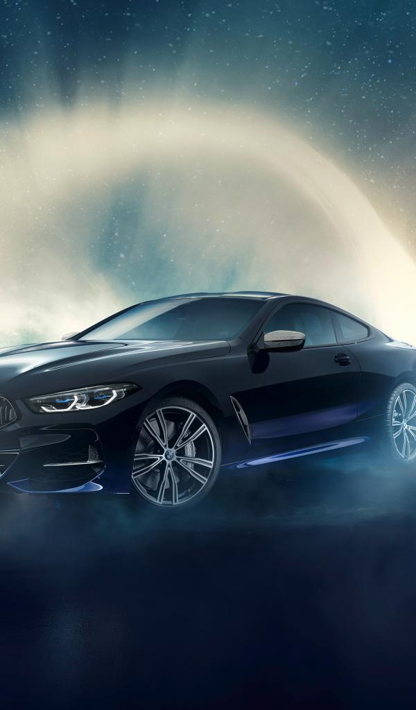 Обои Черный автомобиль BMW M850i, 2019 года на фоне неба