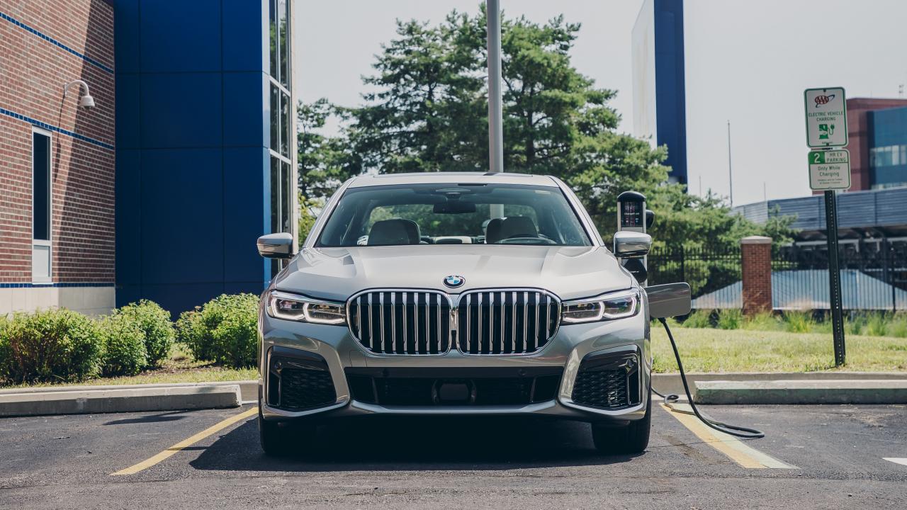 Обои Автомобиль BMW 745e XDrive M Sport, 2020 года на заправке