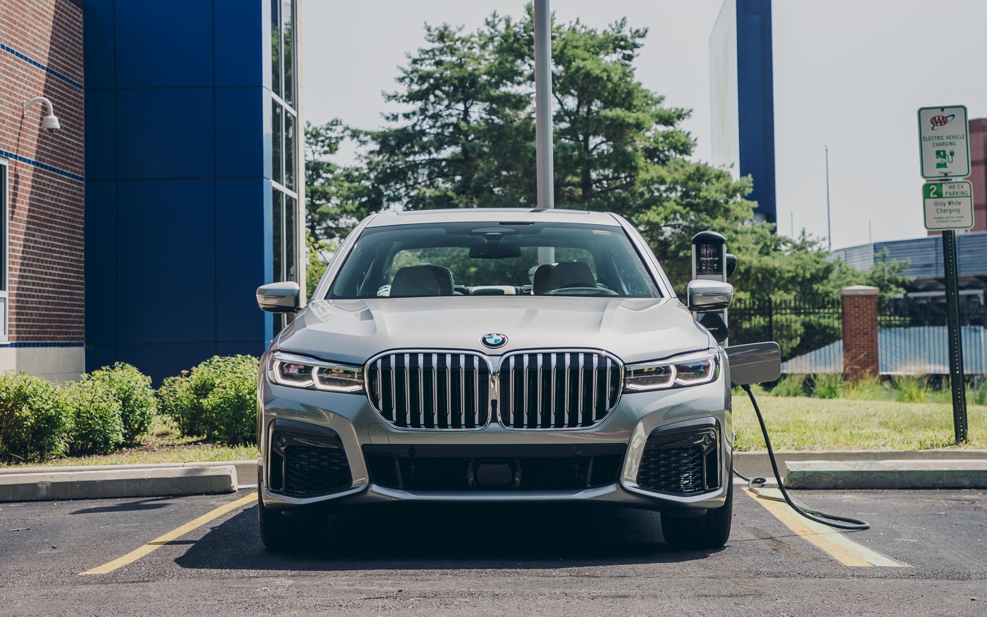 Обои Автомобиль BMW 745e XDrive M Sport, 2020 года на заправке