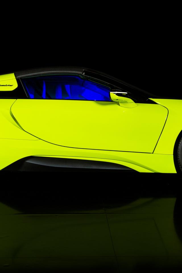 Обои Желтый автомобиль BMW I8 Roadster, 2019 года вид сбоку