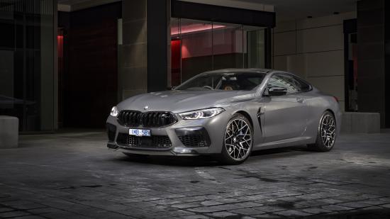 Обои Серебристый автомобиль BMW M8 Competition Coupe 2020 года у здания