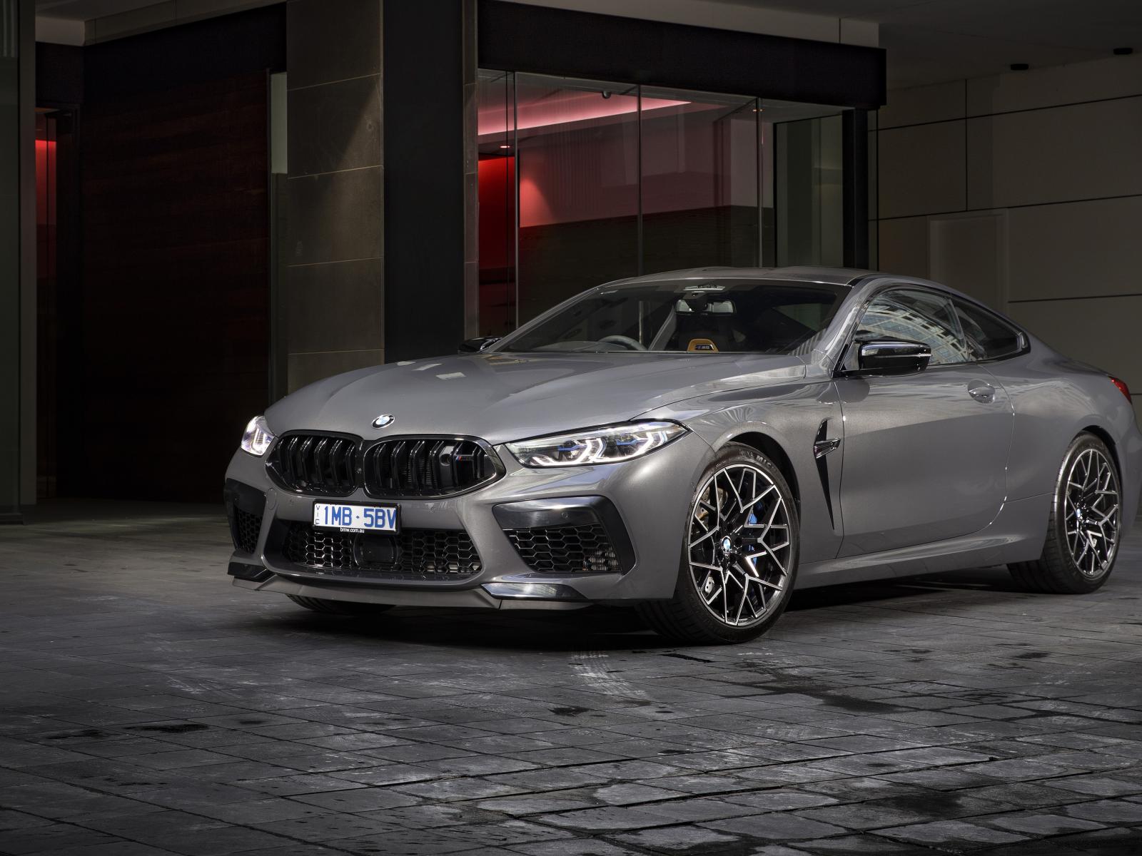 Обои Серебристый автомобиль BMW M8 Competition Coupe 2020 года у здания