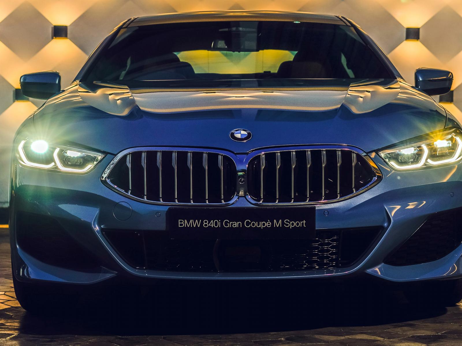 Обои Синий автомобиль BMW 840i M Sport 2020 года крупным планом