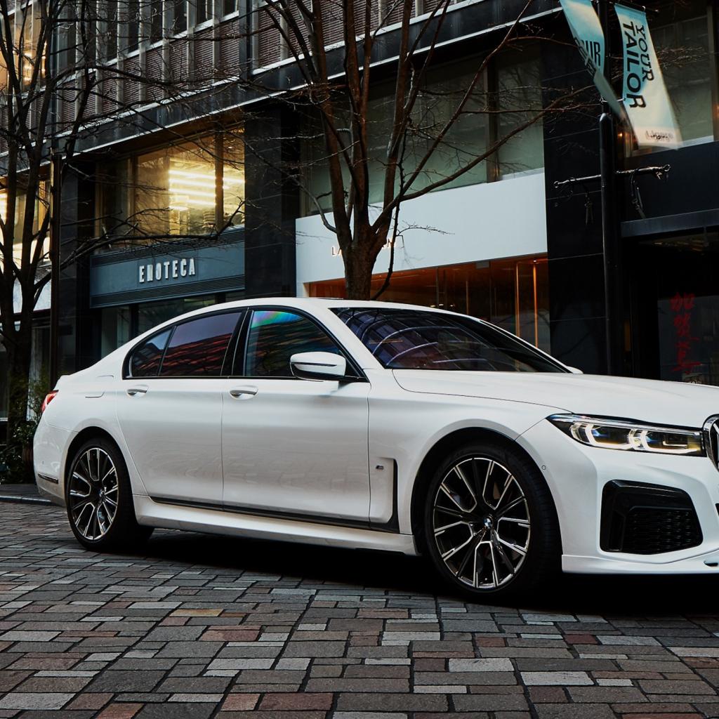 Обои Белый автомобиль BMW 740i M Sport 2020 года у кафе