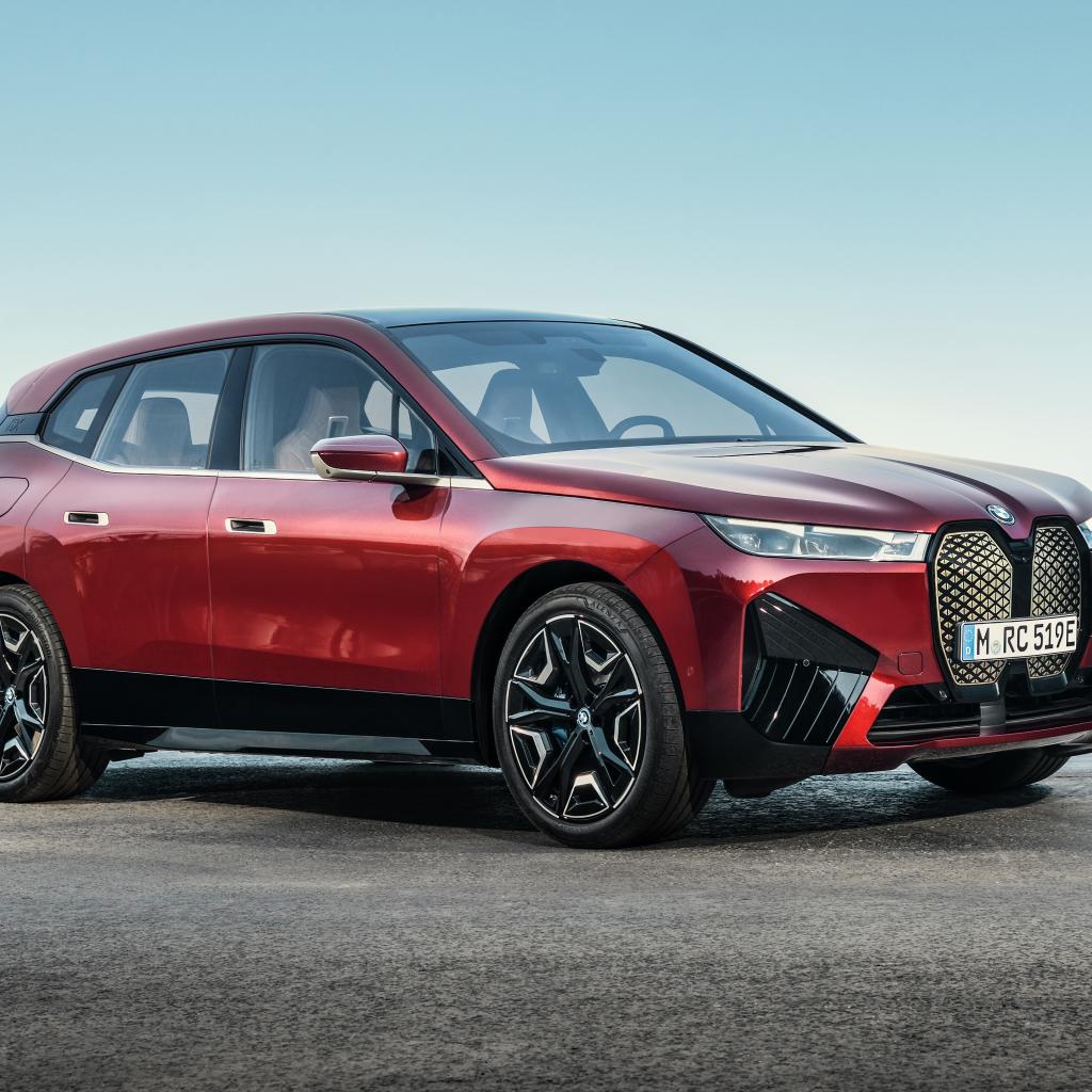 Обои Бордовый автомобиль BMW IX 2021 года у воды