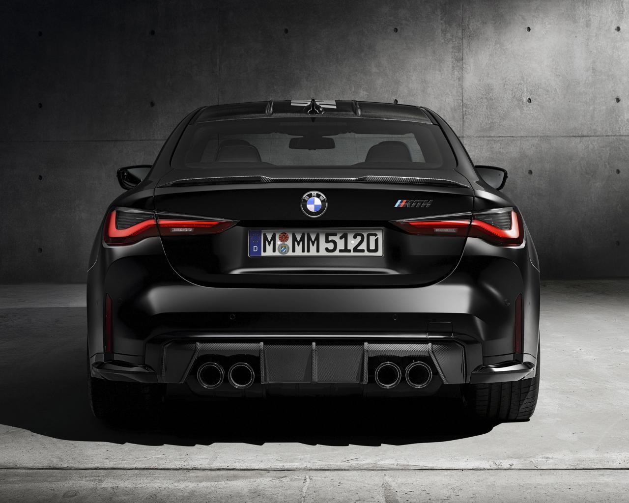 Обои Черный BMW M4, 2021 года вид сзади на сером фоне