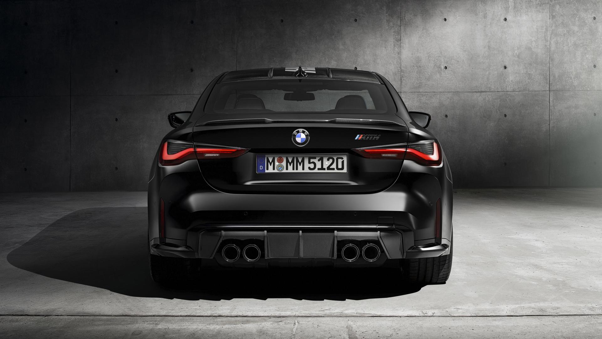 Обои Черный BMW M4, 2021 года вид сзади на сером фоне