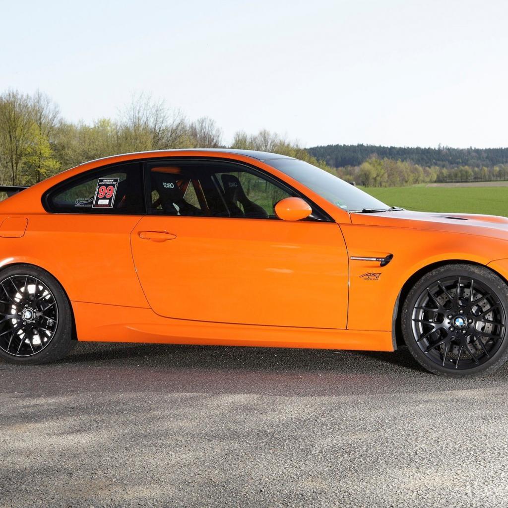 Обои Оранжевый BMW M3 GTS на фоне зеленого поля