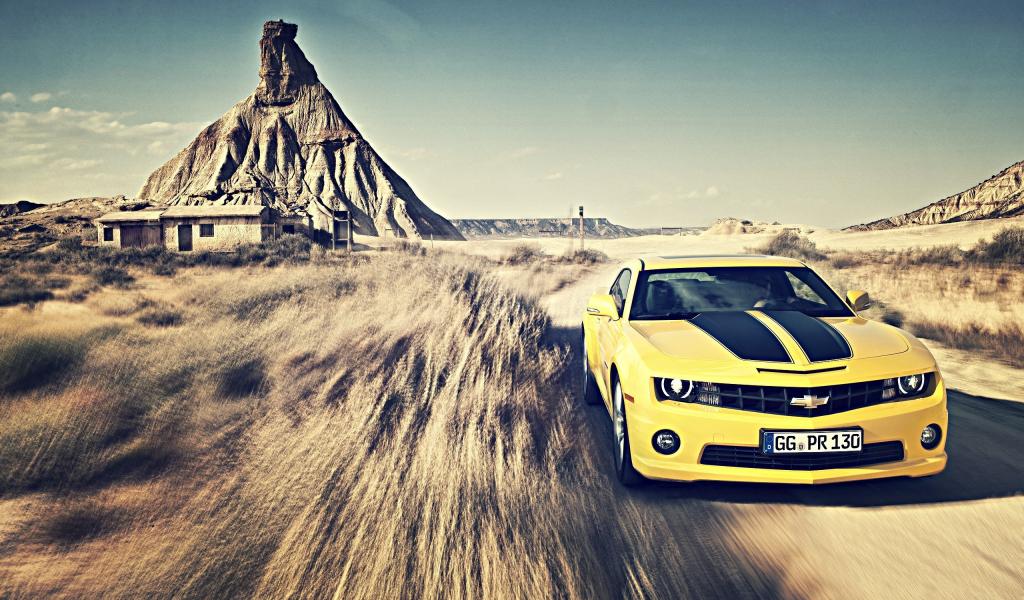 Обои Желтый Chevrolet Camaro мчится по пустыне