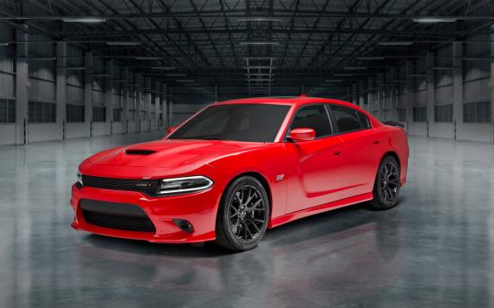 Обои Красный спортивный автомобиль Dodge Charger, 2018 в гараже
