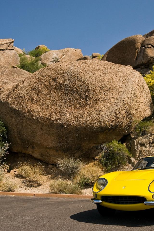 Обои Старый желтый Ferrari у большого камня