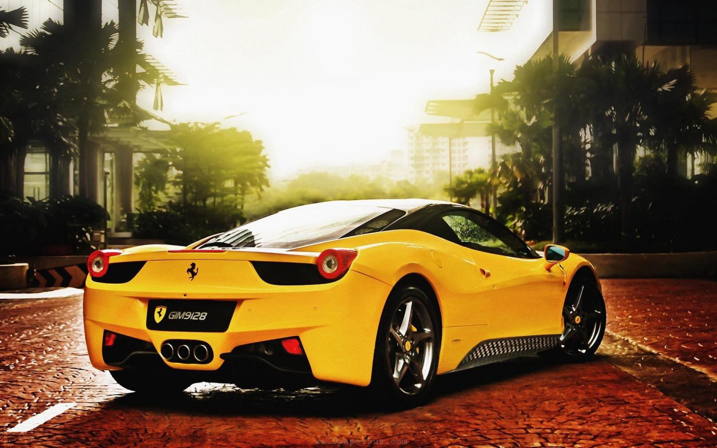 Обои Желтый Ferrari 458 на брусчатке улицы