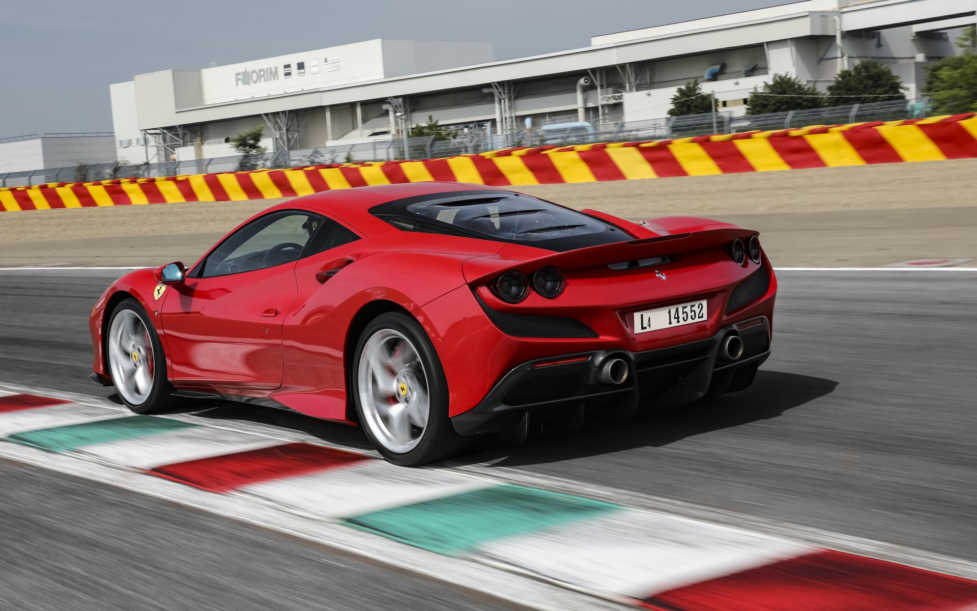 Обои Быстрый красный автомобиль Ferrari F8 Tributo 2019 года на трассе